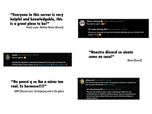 Sumérgete en nuestra Galería virtual reconocida internacionalmente, mostrando docenas de obras NFT 1:1 de artistas de toda Latinoamérica. Conecta con los artistas directamente en nuestro servidor en Discord, y compra las piezas directamente de la Galería. Todos los fondos de cada venta van directamente al artista.